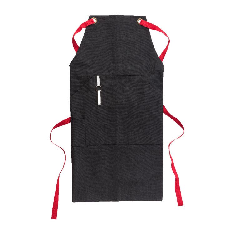 Polyester and cotton apron with colored bands and front pocket. Includes a bottle opener.