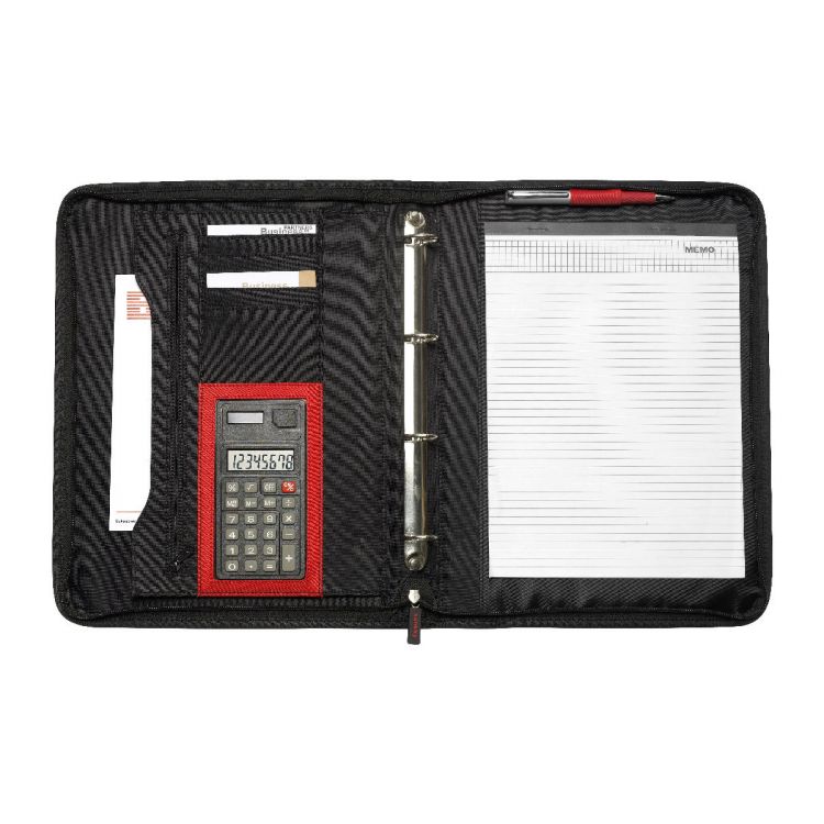 PVC zipped conference folder (approx. A4) with notepad with 20 lined pages, a calculator and multiple pockets, including two pockets with zipper on the front.