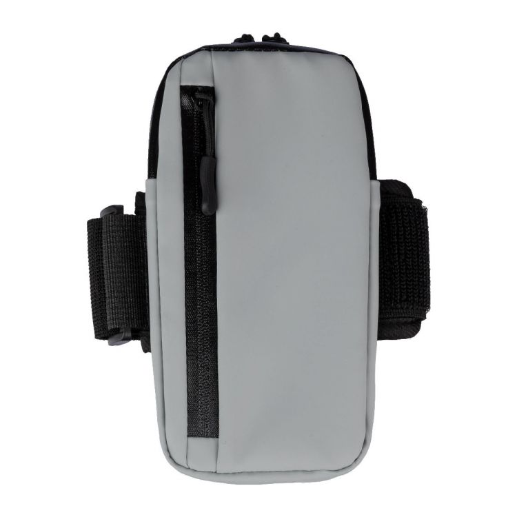 Polyester sports bag designed to be attached to your arm, featuring a PU coating. Includes a large waterproof zippered compartment with a small pocket inside and a waterproof pocket on the front.
