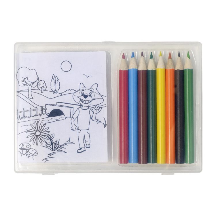 Set of eight coloring pencils and 20 designs in a transparent plastic box.