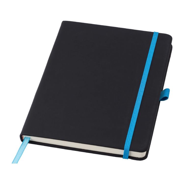 PU notebook (approx. A5) with 96 lined pages, ribbon marker, and elastic band over the cover. When the cover is laser engraved, the design has the same color as the elastic band.