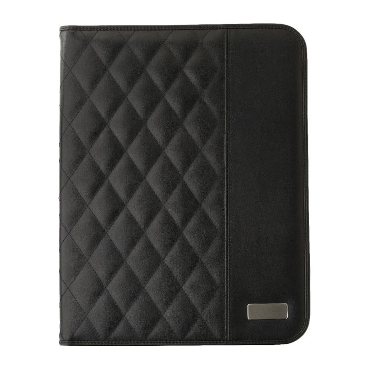 PU padded portfolio (approx. A4), with notepad with 25 lined pages, a mesh pocket for credit cards, multiple other pockets, and an elastic pen loop (pen not included).