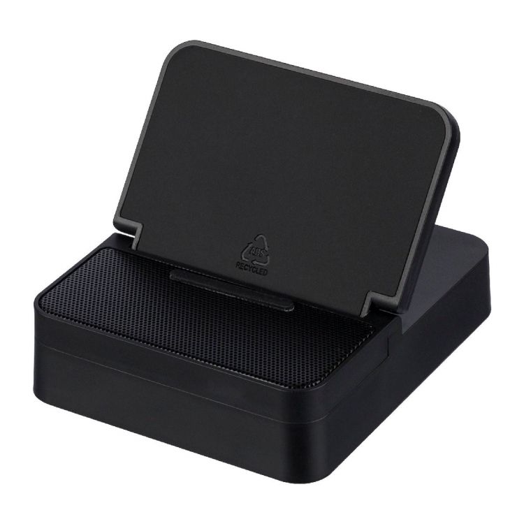 Recycled ABS 3-in-1 wireless charger, speaker, and phone holder in a cube-shaped design. Features 15W fast wireless charging, 5W speaker function, and wireless connection technology version 5.4. Includes a 1200 mAh battery, metal mesh front, and recycled PU detail on the top. Input: 5V/500mA. Marked with a recycled logo. Individually packaged in a brown cardboard box.