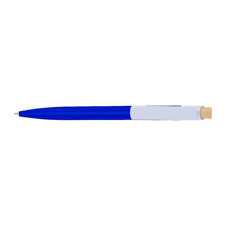 Recycled ABS ballpen with bamboo push button and white clip. Features a recycled logo in the in-mould. Approximate writing length of 600 metres. Blue ink.
