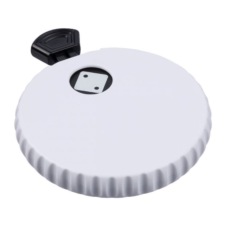 Recycled ABS mechanical dice with push button on the top. Press to spin the internal mechanism and reveal a random number from 1 to 6. Includes a bottle opener on the back and a small Recycled ABS logo. Packed in a recycled polybag.
