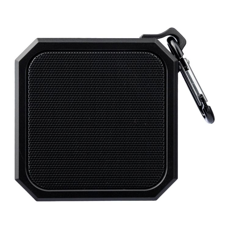 ABS speaker with carabiner and plastic clip. IPX4 rated. 3W output, DC 5V input, 300mAh built-in rechargeable battery, with 2 hours of playing time. Working distance of 15-20 meters, signal-to-noise ratio of 87 dB. Frequency range: 100 Hz to 20 kHz. Includes 50 cm Type-C charging cable. Wireless connection technology: 5.2. Individually packaged in a brown cardboard box.