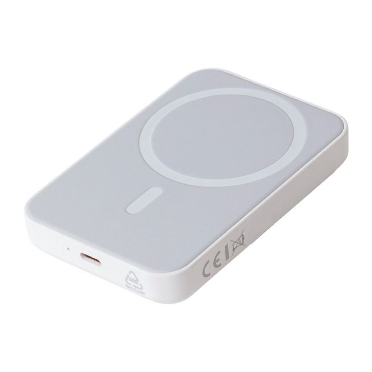 Recycled ABS wireless charger powerbank with 5,000 mAh Li-ion battery and 15W magnetic wireless charging output (MagSafe compatible). Type-C input up to 20W and Type-C output: DC5V/3A, DC9V/2.22A, DC12V/1.67A. Equipped with overheat, short circuit, overvoltage, and overcurrent protection. Automatically stops when overheating. Includes an extra metal ring with adhesive backing to support wireless charging for non-MagSafe devices. Features a label on the side with Recycled ABS (RABS) logo. Individually packaged in a brown cardboard box with tissue paper inside.