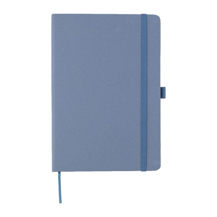 Recycled biowaste and carton notebook A5 with 80 lined pages, printed with soy ink. Each notebook features embossing on the backside corresponding to the color of the referred waste: green for citrus, red for cherry, blue for lavender, khaki for grapes, and light brown for hazelnut. The notebook is covered with Favini paper from Italy and includes 70gsm paper.