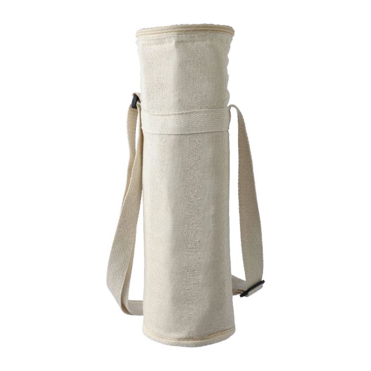 Recycled cotton (270 gsm) bottle cooler bag with 2 mm EPE and 12C PEVA lining inside. Zipper closure. Long adjustable carrying strap. Capacity: 1.5-liter bottle. Includes recycled cotton label on the outside.