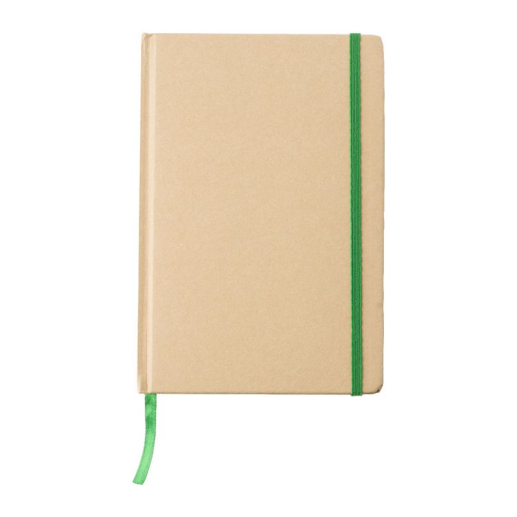 Recycled carton notebook (A5) with 160 lined pages. With elastic to keep closed and a ribbon bookmark.