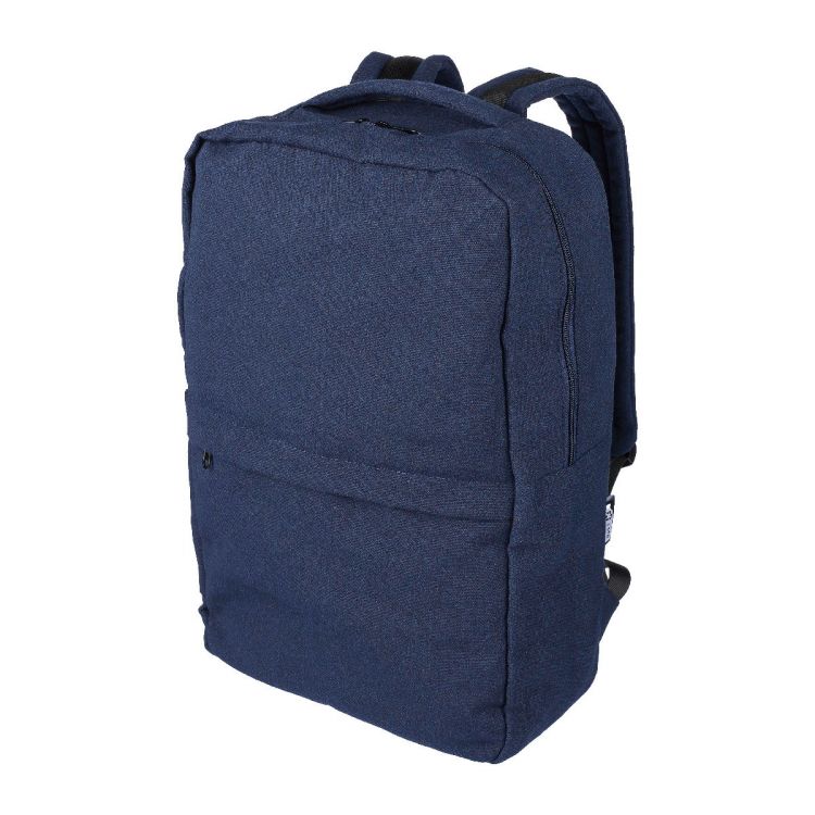 Recycled polycotton (330 gsm) backpack with a 210D polyester lining. Features a large zippered compartment with a padded 15-inch laptop compartment, two inner compartments, and two outer compartments, including a side compartment and a small zippered front pocket. The design includes padded adjustable carrying straps and a handle. Capacity: 14L. Carrying capacity: 13 kg. Includes a label.