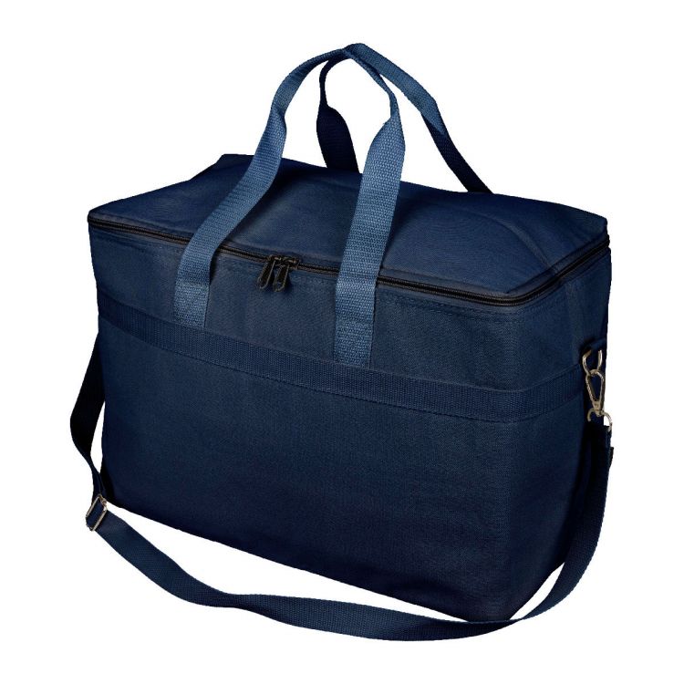 Recycled polycotton (330 gsm) cooler bag with 23 L capacity. Features two carrying handles (3.5 × 60 cm), an adjustable shoulder strap (2.5 × 110 cm) with metal buckle closure, and matching webbing. Insulated with aluminium foil. Includes rPET label on the outside and a label inside.