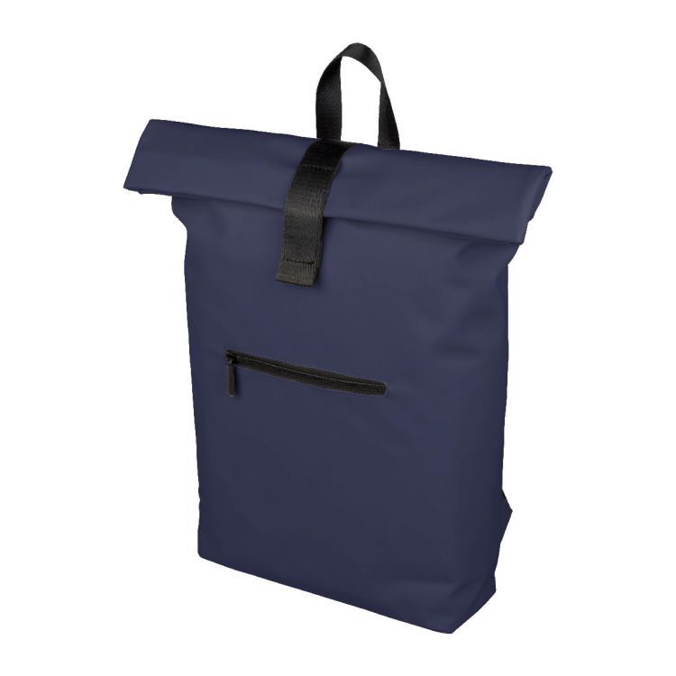 Recycled PU backpack with 19 l capacity and rolltop closing and velcro strip. Features a small zippered front pocket, 16-inch laptop compartment inside, and 210D recycled polyester lining. Includes adjustable ventilated shoulder straps, a top handle, and a single recycled label inside.