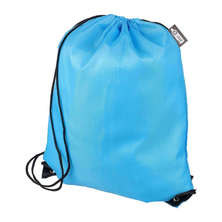 rPET polyester 210D drawstring backpack with two black PU corners on the front and internal sewing. Features a black nylon cord on each side, a pull-cord closure. Capacity: 5L. Carrying capacity: 7 kg. Includes an rPET label.