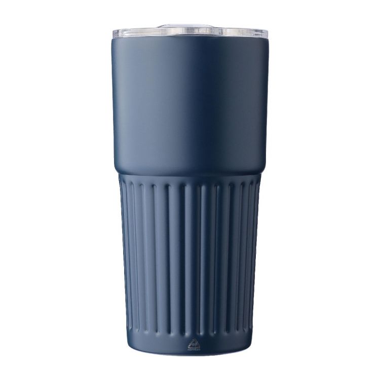 Recycled stainless steel double-walled drinking mug (500 ml). The interior is made of stainless steel 304 and the exterior is stainless steel 201 with a ridge grip design. Features an AS lid with a slide closure. Includes an engraved recycled logo on the body. Individually packaged in a brown cardboard box.