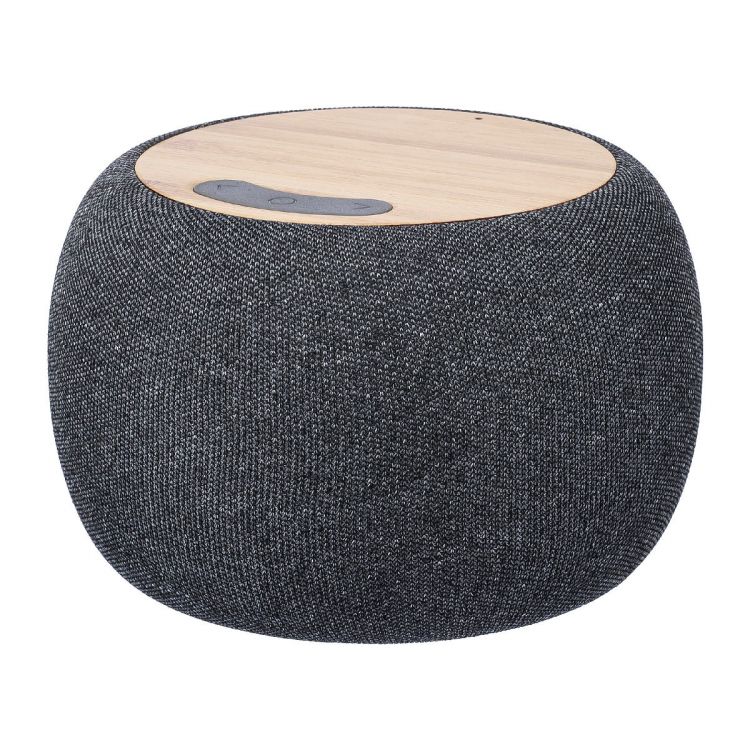 Bamboo and recycled ABS speaker with fabric details around the speaker. 5W output, DC 5V input, 1200mAh built-in rechargeable battery, with 6 hours of playing time. Working distance of 15-20 meters, signal-to-noise ratio of 87 dB. Frequency range: 100 Hz to 20 kHz. Includes 50 cm Type-C charging cable. 5W Wireless charging, Wireless connection technology: 5.2. Individually packaged in a brown cardboard box.