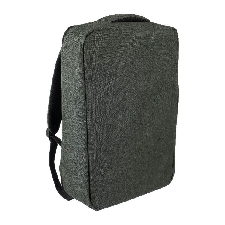 rPET polyester 300D laptop backpack with a 210D rPET lining. Features a large zippered compartment with multiple insert pockets, a Velcro-closure laptop pocket for 15-inch laptop, and a 12L capacity. The design includes a reinforced, ventilated backing, adjustable shoulder straps, a side carrying handle, and a trolley strap. Carrying capacity: 10 kg.