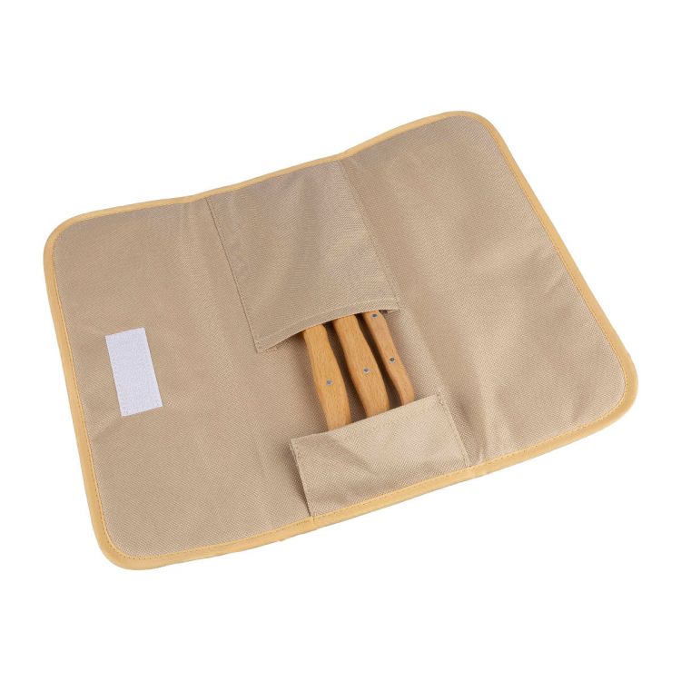 rPET charcuterie set in a 600D Velcro-closed pouch, including three stainless steel knives with wooden handles. Features an rPET label inside. Food-safe. Individually packaged in a brown cardboard box.