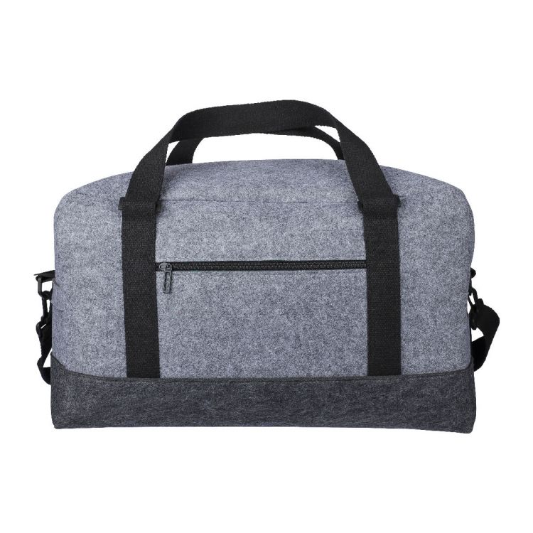 rPET sports bag made of felt with canvas carrying handles and an adjustable shoulder strap. Features a large zippered compartment and a small zippered compartment on the front. Includes an rPET label. Capacity: 30L. Carrying capacity: 10 kg.