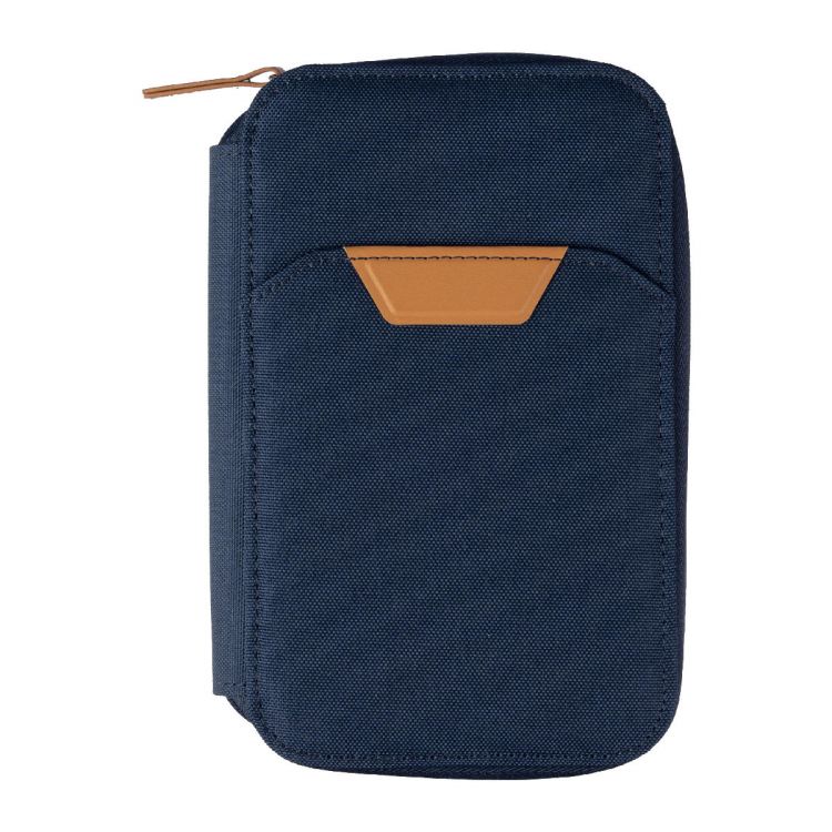 rPET travel wallet with PU details and zipper. RFID protection inside. Includes mobile phone holder and multiple compartments, including a small front pocket. Individually packaged in a brown carton box.
