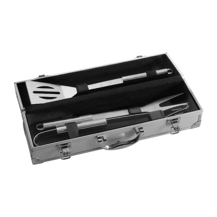 Stainless steel, three-piece barbecue set in an aluminium case, including: spatula, fork and tongs.