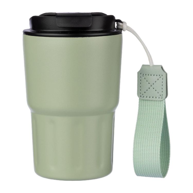 Stainless steel powder-coated double-walled drinking mug (320 ml). Stainless steel 304 inside and stainless steel 201 outside. Carrying band on the side and PP lid. Packaged per piece in a brown carton box.