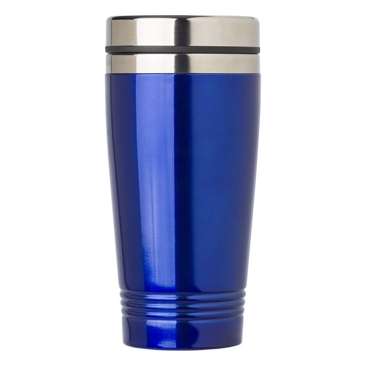 Stainless steel drinking mug (450 ml) with lid. Suitable for hot content up to 70 degrees Celsius. Lid has a sliding opening for drinking. Anti-slip bottom. Individually packaged in a brown cardboard box.