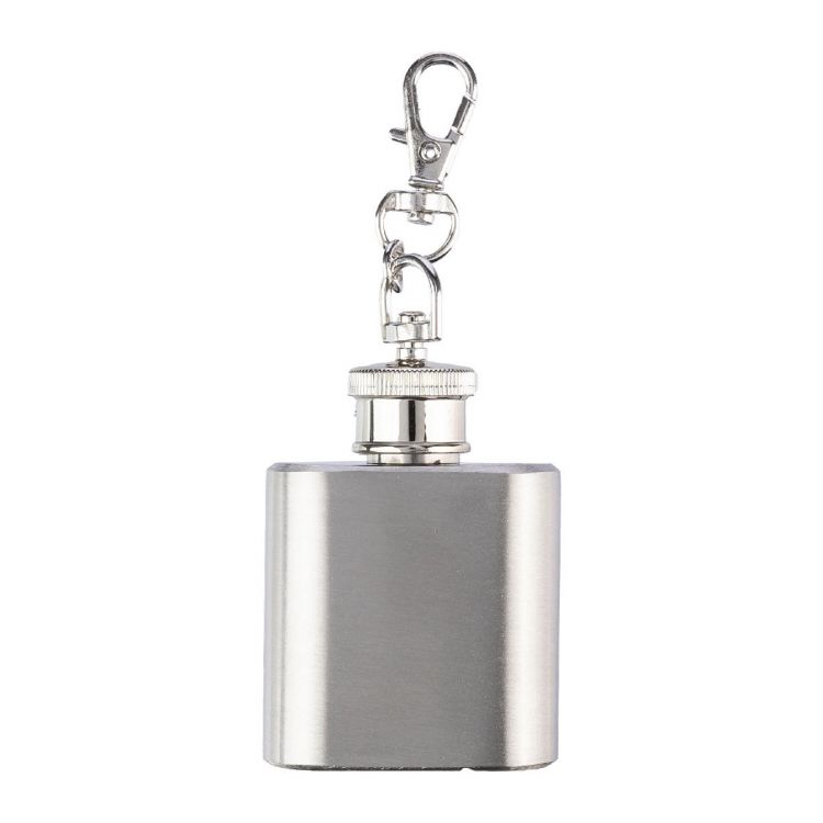 Stainless steel (s/s304) hip flask (30 ml) with carabiner key chain. Packaged per piece in a brown carton box.