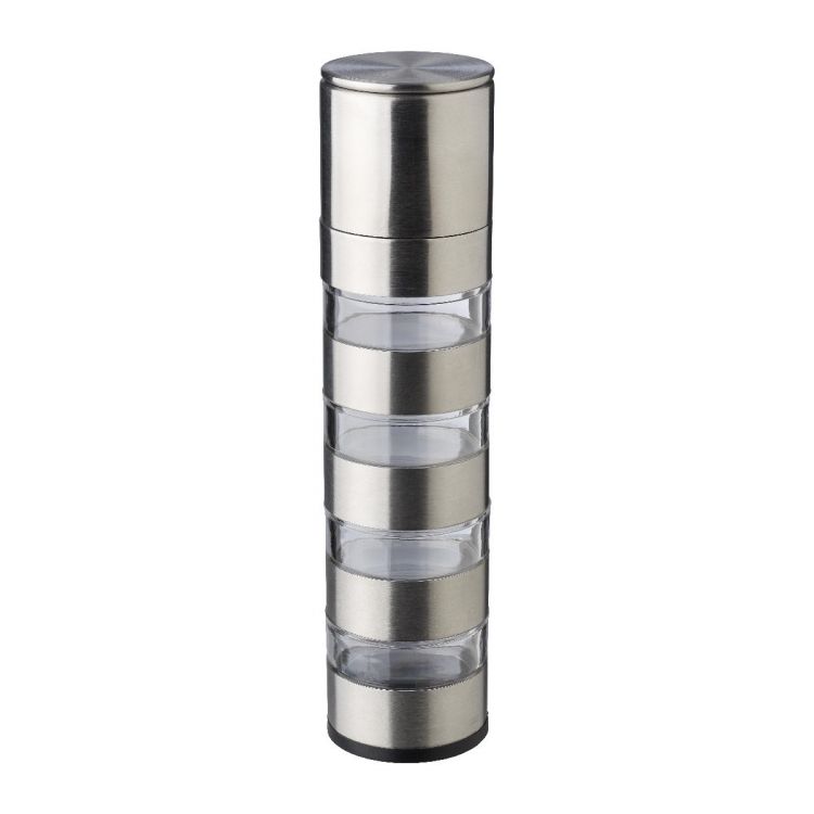 Stainless steel spice grinder with 4 compartments and ceramic mill. Individually packaged in a brown cardboard box.