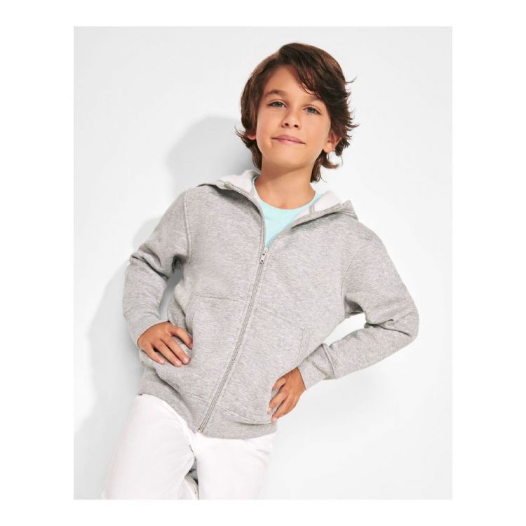 Sweat hooded jacket with high neck and full zip, ribbed detail in hood and pocket piping, kangaroo style pocket, 2x2 rib in cuffs and waist, 98% cotton / 2% carbon fibre, twill, 360 g/m² 3-4 [38cm/45cm] 5-6 [40cm/49cm] 7-8 [42cm/53cm] 9-10 [44cm/57cm] 11-12 [46cm/61cm]