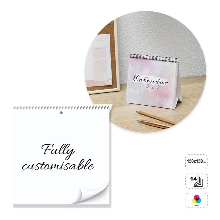 Square desk calendar, fully customisable. The product consists of 14 sheets of 135 gram matt coated paper, printable front or front and back in full colour. Bound with a silver, white or black metal spiral at the top. Non-printable 300 g white cardboard backing. The calendar can be customised by modifying the preset template, or completely constructed following the guidelines provided in a neutral template.