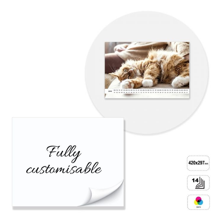 Horizontal wall calendar, fully customisable. The product consists of 14 sheets of 135 gram matt coated paper glued at the top with a 5 mm hole. Product can be printed on the front in full colour. Non-printable 300 g white cardboard backing. The calendar can be customised by modifying the preset template, or completely constructed following the guidelines provided in a neutral template.