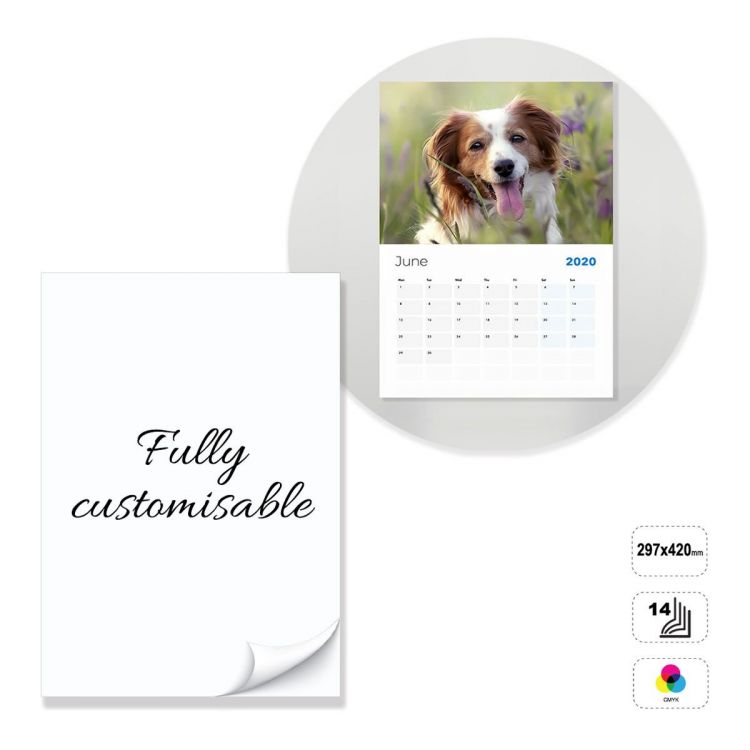 Vertical wall calendar, fully customisable. The product consists of 14 sheets of 135 gram matt coated paper glued at the top with a 5 mm hole. Product can be printed on the front in full colour. Non-printable 300 g white cardboard backing. The calendar can be customised by modifying the preset template, or completely constructed following the guidelines provided in a neutral template.