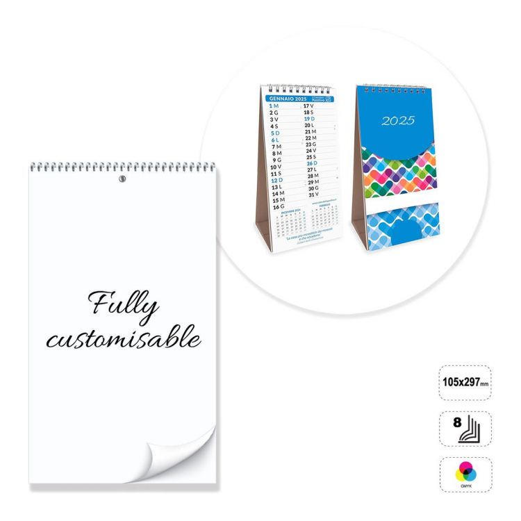 Vertical desk calendar, fully customisable. The product consists of 8 sheets of 135 gram matt coated paper that can be printed front or front and back in full colour. Bound with a silver, white or black metal spiral at the top. Non-printable 300 g white cardboard backing. The calendar can be customised by modifying the preset template, or completely constructed following the guidelines provided in a neutral template.