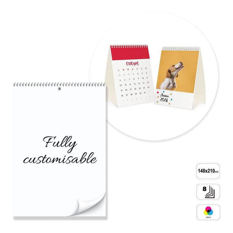 Vertical desk calendar, fully customisable. The product consists of 8 sheets of 135 gram matt coated paper that can be printed front or front and back in full colour. Bound with a silver, white or black metal spiral at the top. Non-printable 300 g white cardboard backing. The calendar can be customised by modifying the preset template, or completely constructed following the guidelines provided in a neutral template.