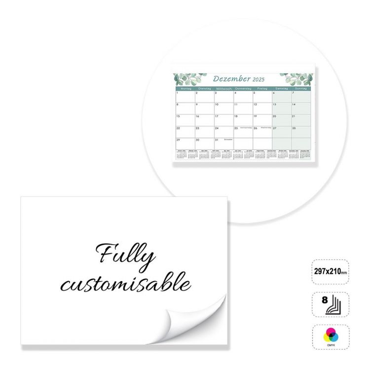 Horizontal wall calendar, fully customisable. The product consists of 8 sheets of 135 gram matt coated paper glued at the top with a 5 mm hole. Product can be printed on the front in full colour. Non-printable 300 g white cardboard backing. The calendar can be customised by modifying the preset template, or completely constructed following the guidelines provided in a neutral template.