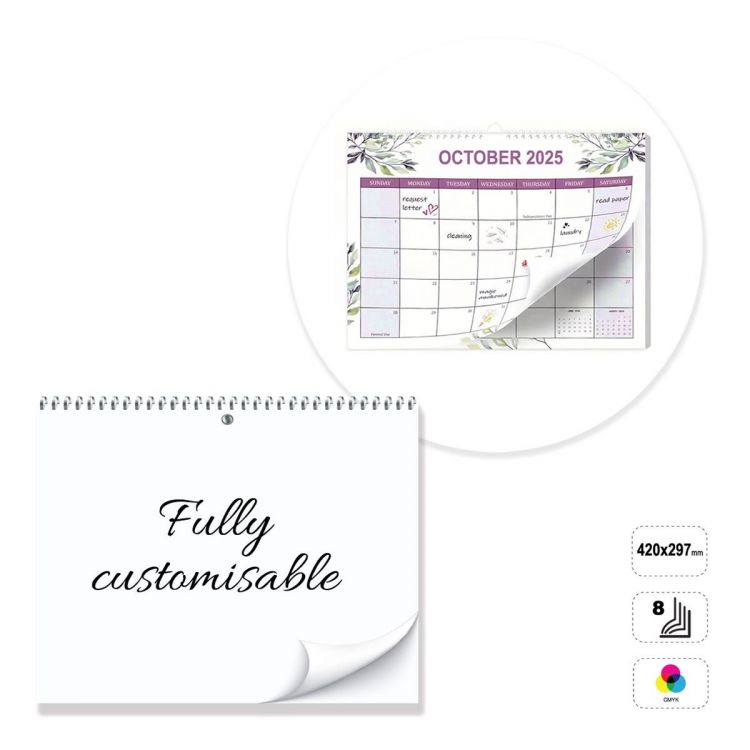 Horizontal wall calendar, fully customisable. The product consists of 8 sheets of 135 gram matt coated paper, printable front or front and back in full colour. Bound with a silver, white or black metal spiral at the top. Non-printable 300 g white cardboard backing. The calendar can be customised by modifying the preset template, or completely constructed following the guidelines provided in a neutral template.