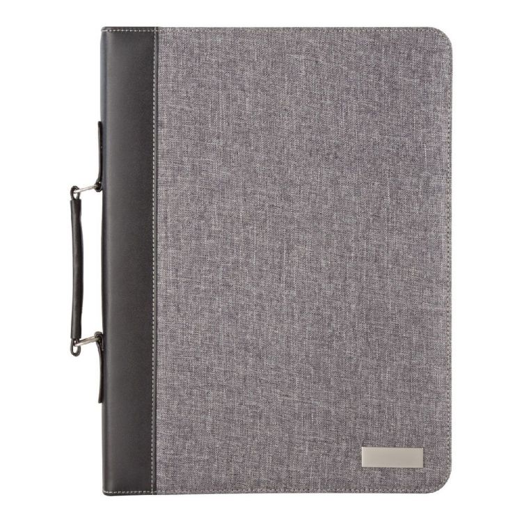 Linen and PU leather covered, A4-sized zipped document folder with handle, 20 lined sheets notepad, solar-power calculator and metal plate