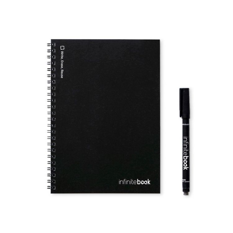 A5 notebook - "Infinitebook" - with flexible cover and matching colour rings. Contains 15 whiteboard-style plain pages and a black marker. This notepad enables easy writing and erasing and is a practical solution for minimising paper consumption. Notes can be scanned. Made in Europe. Supplied in a kraft paper envelope with a sticker. Product in black color