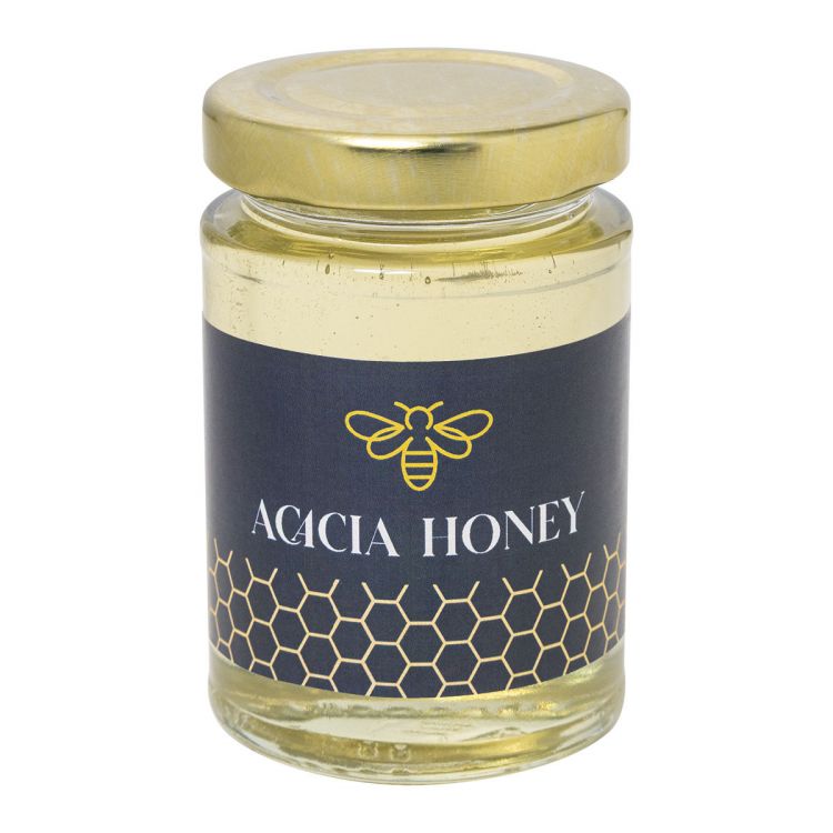 Acacia honey in clean glass jar with metal lid, 135 grams