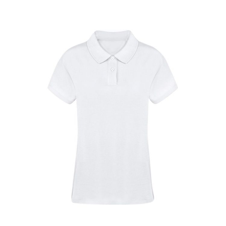 Woman pique polo shirt in white. In 100% cotton material 220g/m2. With two matching button fastenings and side openings at the hem. Easily removable label. Sizes S, M, L, XL, XXL, 3XL.
