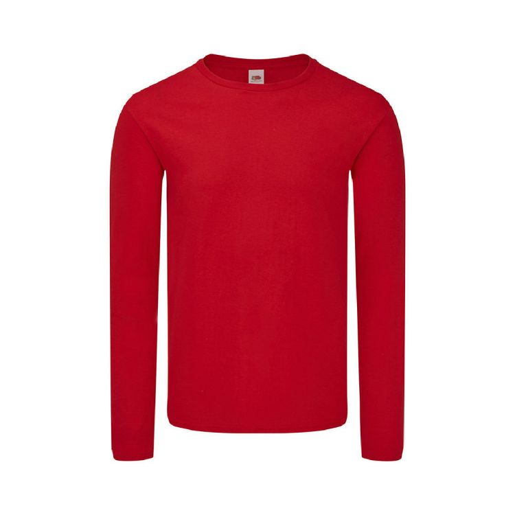 Adult color T-shirt Iconic Long Sleeve by Fruit Of The Loom. Made in 100% brushed cotton Ring Spun 150g/m2. Soft touch and classic cut, with narrow 1x1 ribbed crew neck and matching placket. Easily removable label and available in a wide range of colors. Sizes S, M, L, XL, XXL. (red color, size XL)