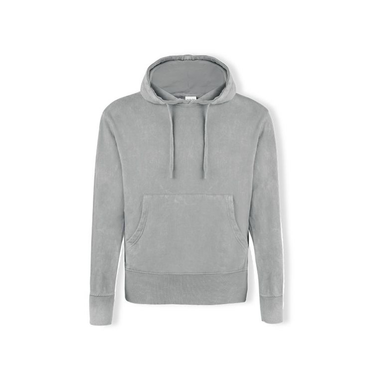 Unisex hooded sweatshirt with washed jeans effect, making each piece unique and unrepeatable. Kangaroo pocket, with extra wide elastic bands for a perfect fit. Contrast color in the elastic bands of cuffs and hem. Made in 100% combed cotton 280g/m2. Soft touch and modern cut, with adjustable flat strings and embroidered eyelets, avoiding the use of metal. Double stitching for durability and resistance to intensive wear. Easily removable label and available in sizes XS, S, M, L, XL and XXL.