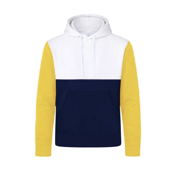 Tricolor unisex hooded sweatshirt, with kangaroo pocket and extra wide elastic bands for a perfect fit. Made in combination of cotton and polyester 280g/m2. In side in brushed terry for a premium quality feel. Soft touch and modern cut, with adjustable flat strings and embroidered eyelets, avoiding the use of metal. Double stitching for durability and resistance to intensive wear. Easily removable label and available in sizes XS, S, M, L, XL and XXL.