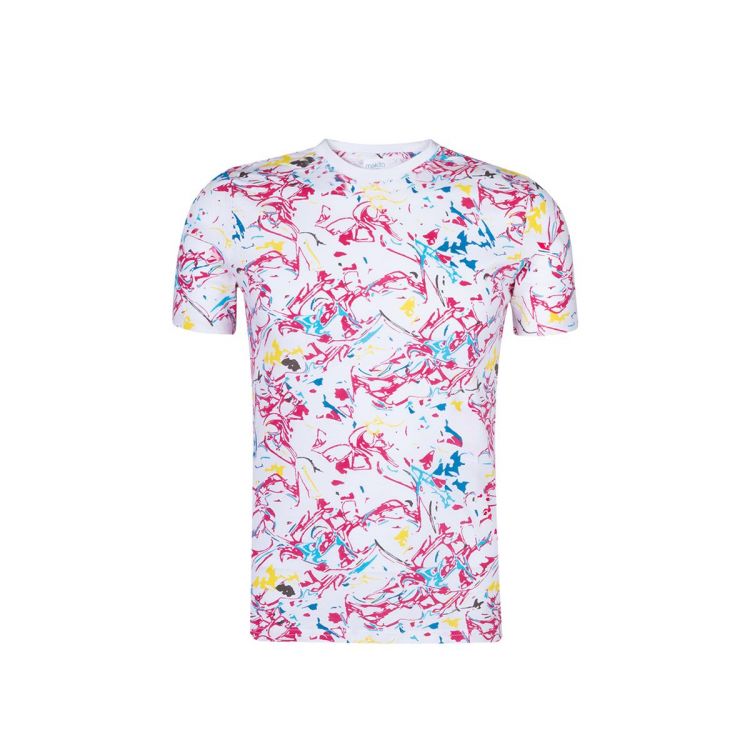 Unisex T-shirt with vivid colors pattern. Made in 100% Ring Spun combed cotton 150g/m2. Soft feel and modern cut. Narrow round neck in 2x2 rib. Double stitching on hem and sleeves for durability and resistance to intensive wear. Easily removable label and available in sizes XS, S, M, L, XL and XXL.