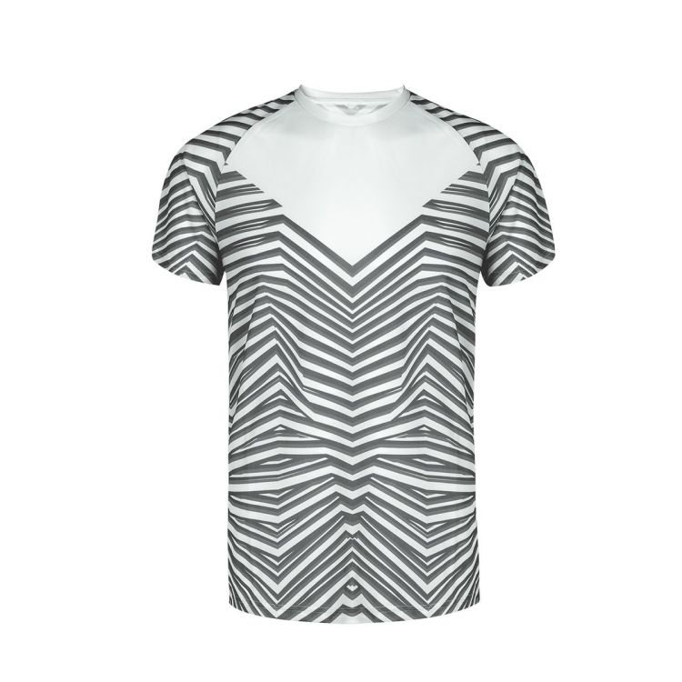 Adult technical T-shirt in 135g/m2 polyester, breathable and with a soft touch. With innovative striped print and a blank area on the chest for branding. With raglan sleeves and round neck. Available in a wide range of colours and in sizes XS, S, M, L, XL, XXL.