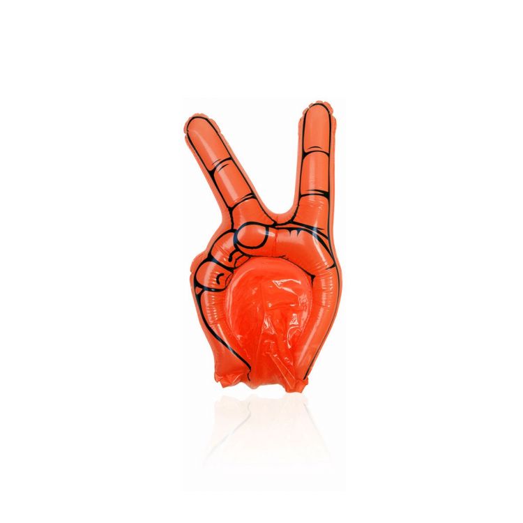 Fun animation hand of victory in resistant, colorful LDPE material. Reusable and with inflation valve included.