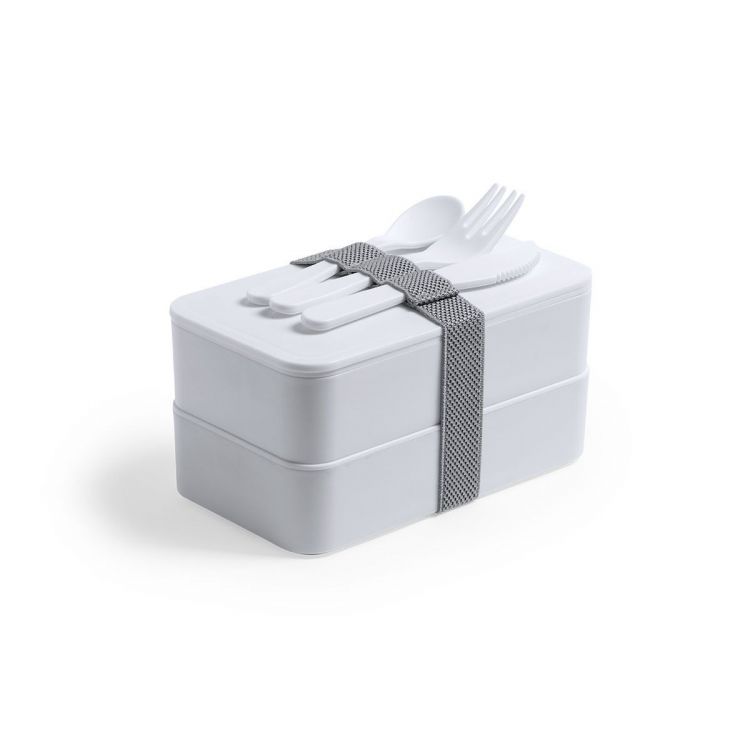 Antibacterial lunch box in durable PP material with a solid finish, BPA free. Two compartments, each with 700 ml capacity and safety belt with fork, spoon and knife. Products with antibacterial treatments are able to drastically reduce the bacterial levels present on the surfaces of the materials, thanks to the addition of permanent static microbial agents, with high effectiveness in inhibiting and preventing bacterial contamination. Item according to the ISO 22196 standard, which determines the antibacterial activity in plastic materials and non-porous surfaces. This allows us to know the effectiveness of microbial inhibition that additives have on treated objects by means of a quantitave evaluation. (white color)