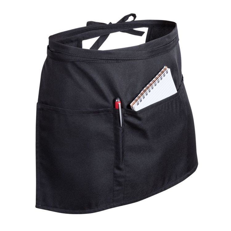 Apron for waist in 100% polyester material, smooth finish in an elegant black. With 2 large pockets, one medium pocket and pen holder. Adjustable by straps. (black color)