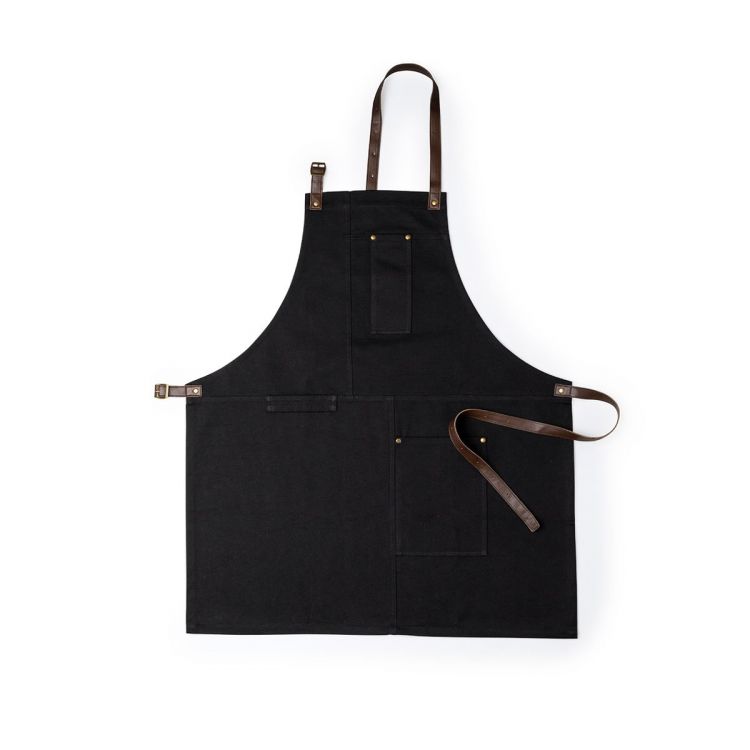 Pro apron in high quality, in resistant cotton canvas material of 340g/m2. Fitting under the knee, with neck and waist straps in resistant PU leather, with buckle adjustments and reinforced with metal rivets. Including many pockets for several utensils, with reinforced stitching.
